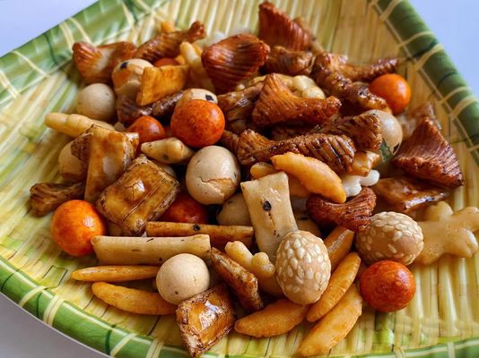 चावल, मूंगफली, टैपिओका स्टार्च, स्टार्च, माल्टो डेक्सट्रिन, चीनी, सोया सॉस, नमक, समुद्री शैवाल, E160c, E150c
